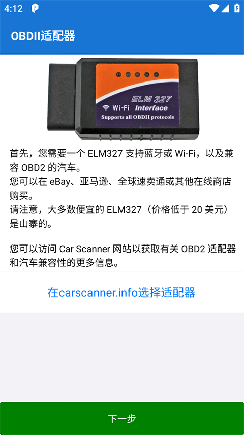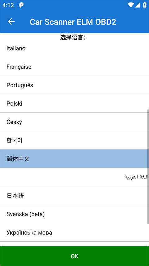 1、打开Car Scanner汽车扫描仪软件,首先先选择操作语言为简体中文;