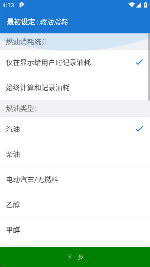 7、燃油消耗统计、类型,下一步;