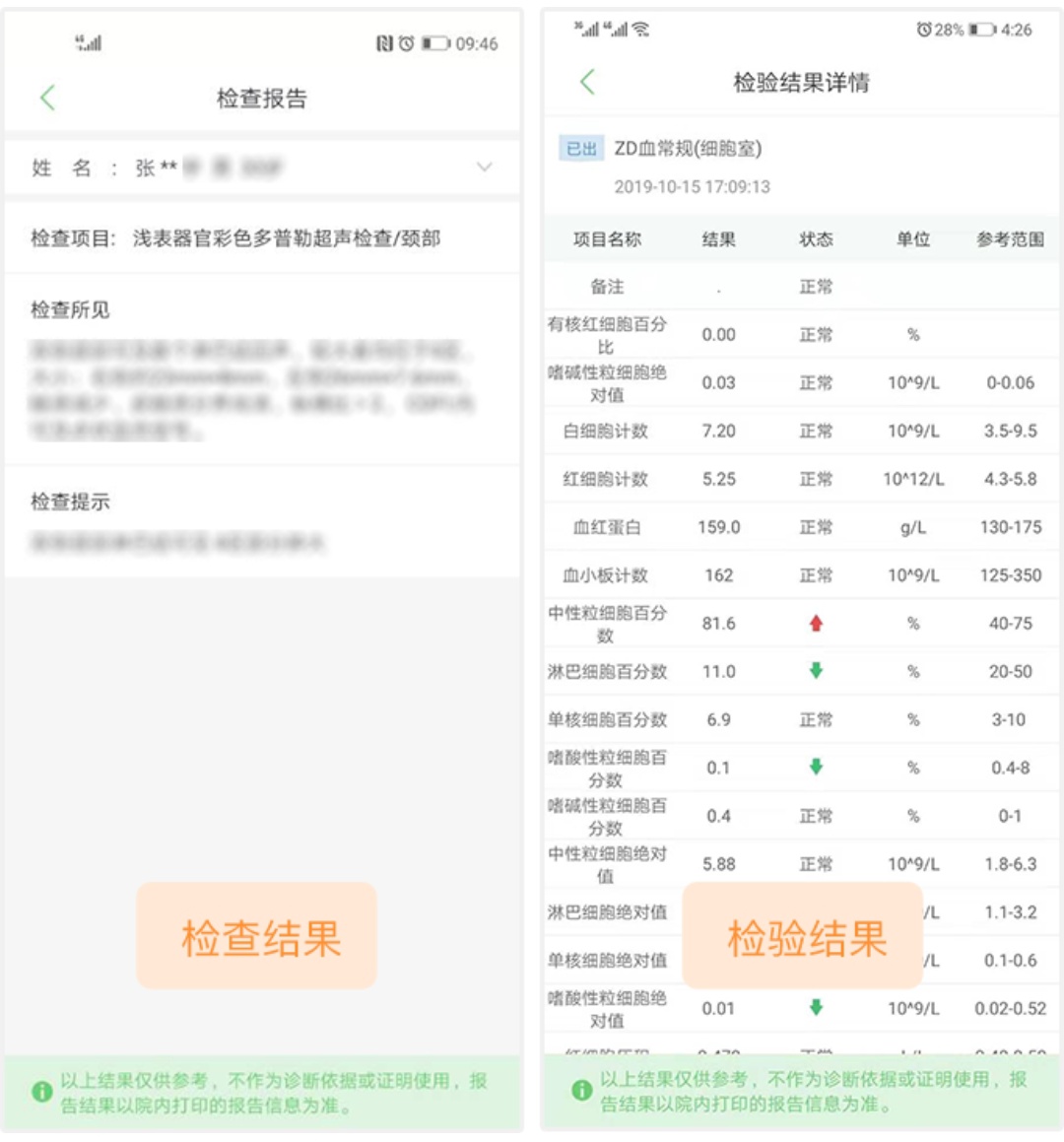 患者可通过“检查/检验结果”模块及时查询检查/检验结果信息。