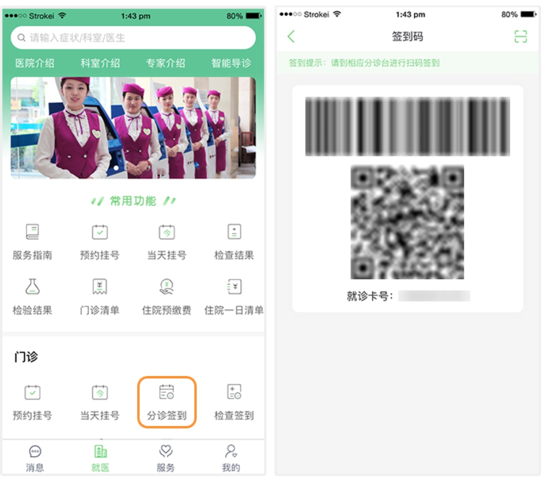 就诊当天到挂号科室所在分诊区的报到机上扫描手机上的分诊签到二维码报到,报到成功后等待叫号就诊。