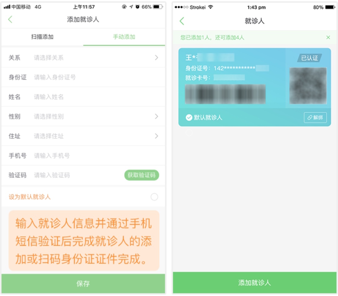 通过上传身份证件或者手动填写个人信息添加就诊人,并完成就诊人与就诊卡的绑定。