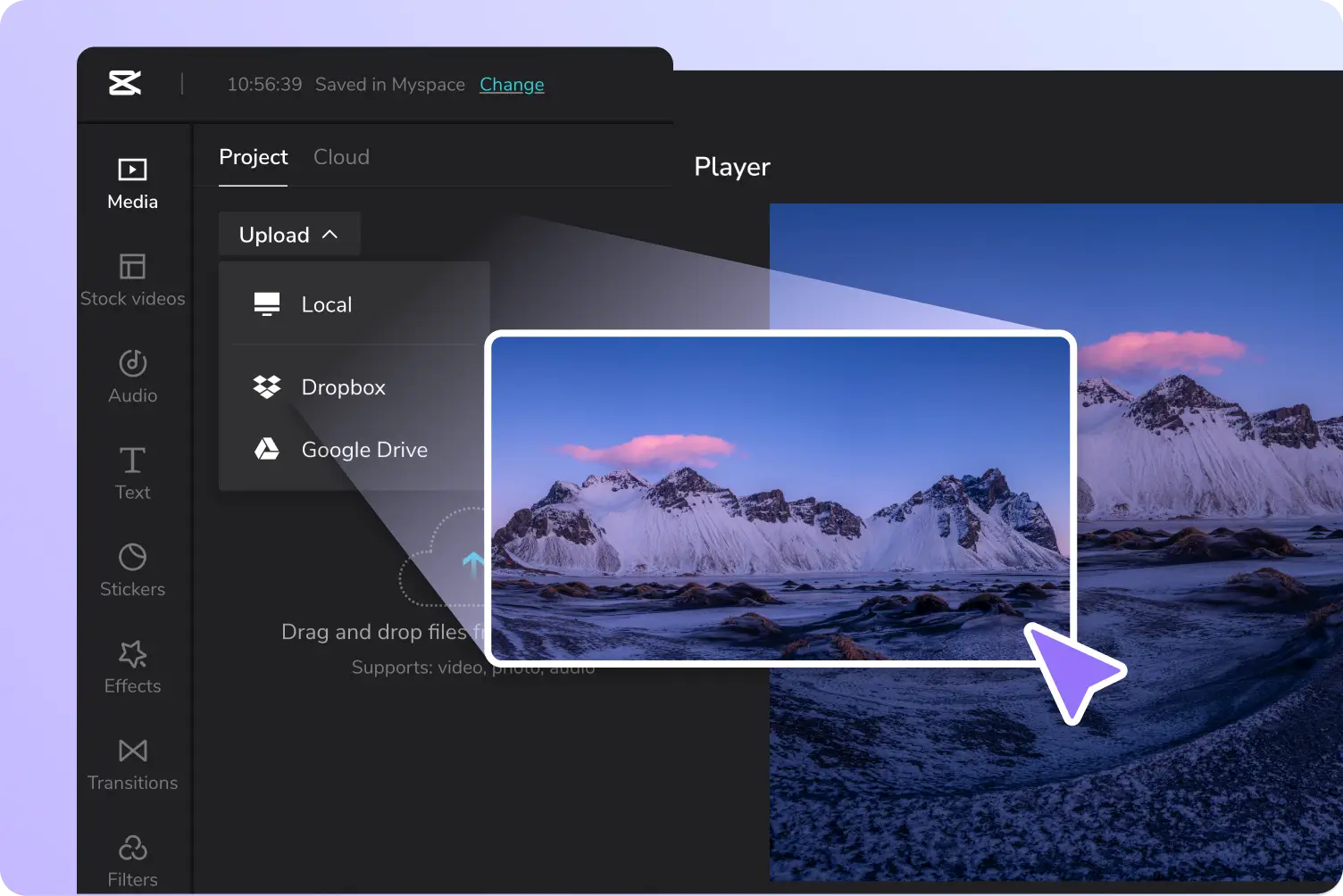 登录 CapCut 以打开您的工作区。从您的计算机、Google Drive、Dropbox 或 Myspace 上传媒体文件。