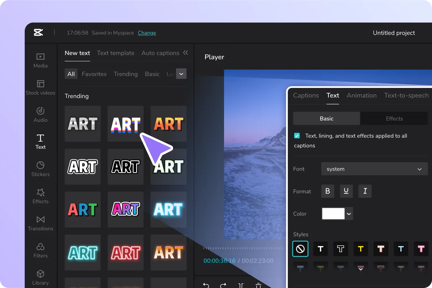 转到 “Text” 面板以选择所需的文本样式或模板。通过单击“+”图标将其添加到文本时间线。将光标悬停在添加的文本上,并自定义其样式、格式、字体、颜色、间距、透明度和对齐方式。您可以为文本添加动画效果或将其转换为逼真语音的语音。所有自定义选项都触手可及。