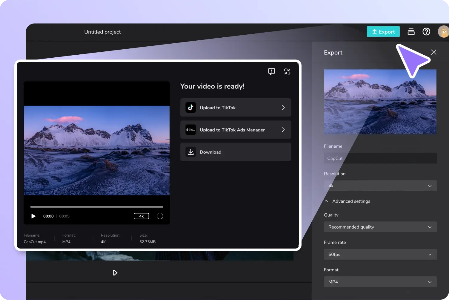 设置参数,包括文件名、分辨率、格式和质量。下载视频或在 TikTok 等社交媒体渠道上分享。