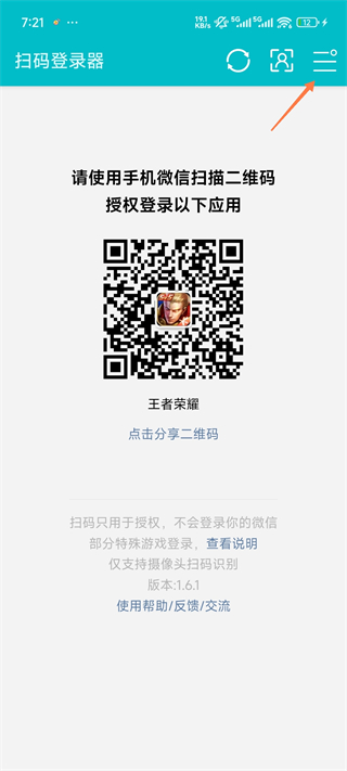 1、打开游戏扫码登录器App,点击右上角的【三】