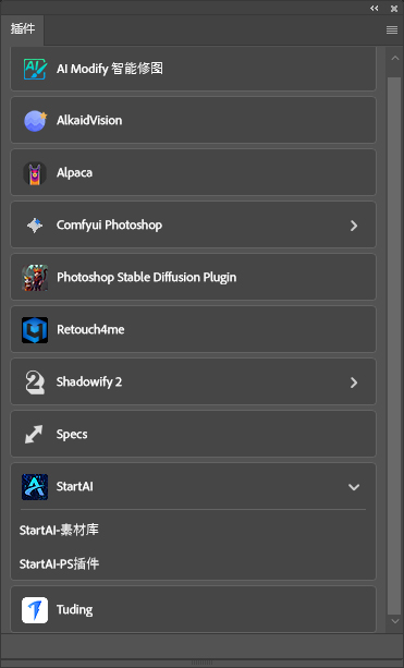 6、软件自带插件,界面如下,包括了ai modify智能修图,alpaca,shadowify 2等;