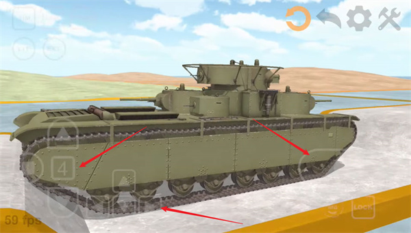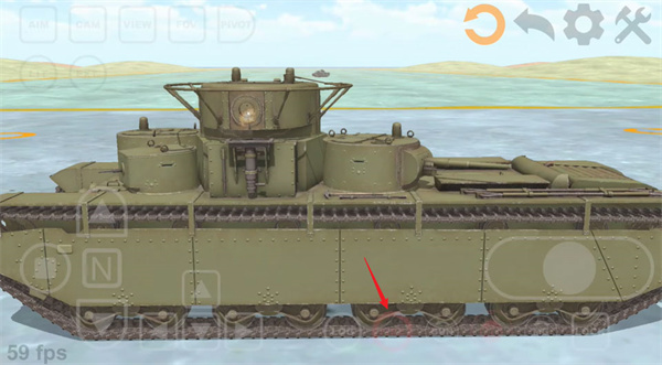 3、操作方面,屏幕左侧的按键负责控制坦克前进与后退,右侧按钮用于调整行进方向;右下区域的第一个按键用于开火,第二个按键则可以让炮塔视角随镜头同步转动。