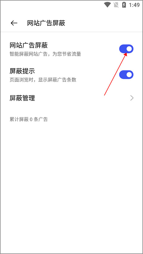 3、在设置界面,找到网站广告屏蔽并点击。