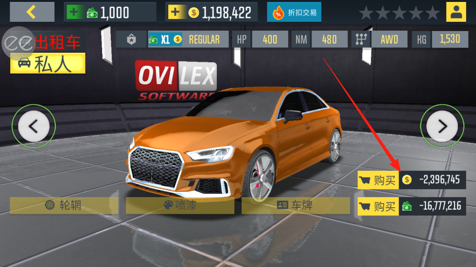 4、车辆升级改装:用赚取的收入购买新车,升级发动机、刹车、悬挂,改装外观颜色和轮毂。