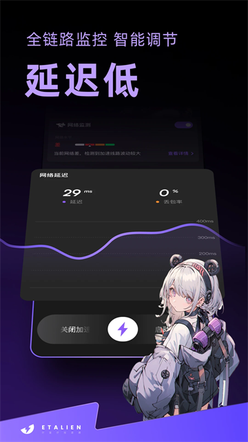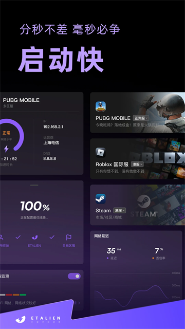 3、极低延迟零丢包:针对FPS、MOBA等对延迟敏感的游戏进行底层协议优化,有效降低网络抖动与数据丢包率,告别460与卡顿,让技能释放快人一步。