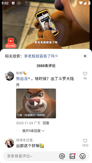 2、点击视频下方的评论按钮即可进入评论区,不仅能查看热门评论、参与讨论,还能看到相关搜索推荐,轻松发现更多同类话题和感兴趣的内容。