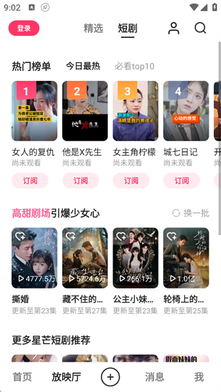 3、进入「放映厅」→「短剧」板块,可按照热门榜单、今日最热等分类进行筛选,支持订阅喜爱的短剧,更新后第一时间提醒,免费观看海量精彩短剧内容。