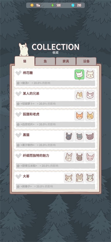 游戏汇集了布偶猫、挪威森林猫、伯曼猫、喜马拉雅猫、缅因猫、西伯利亚猫、英国短毛猫等各式各样漫画卡通插图风格的猫咪 。每只猫咪都有自己独特的名字和个性,你甚至可以给猫咪起名字,培养属于你自己的猫咪团队 。