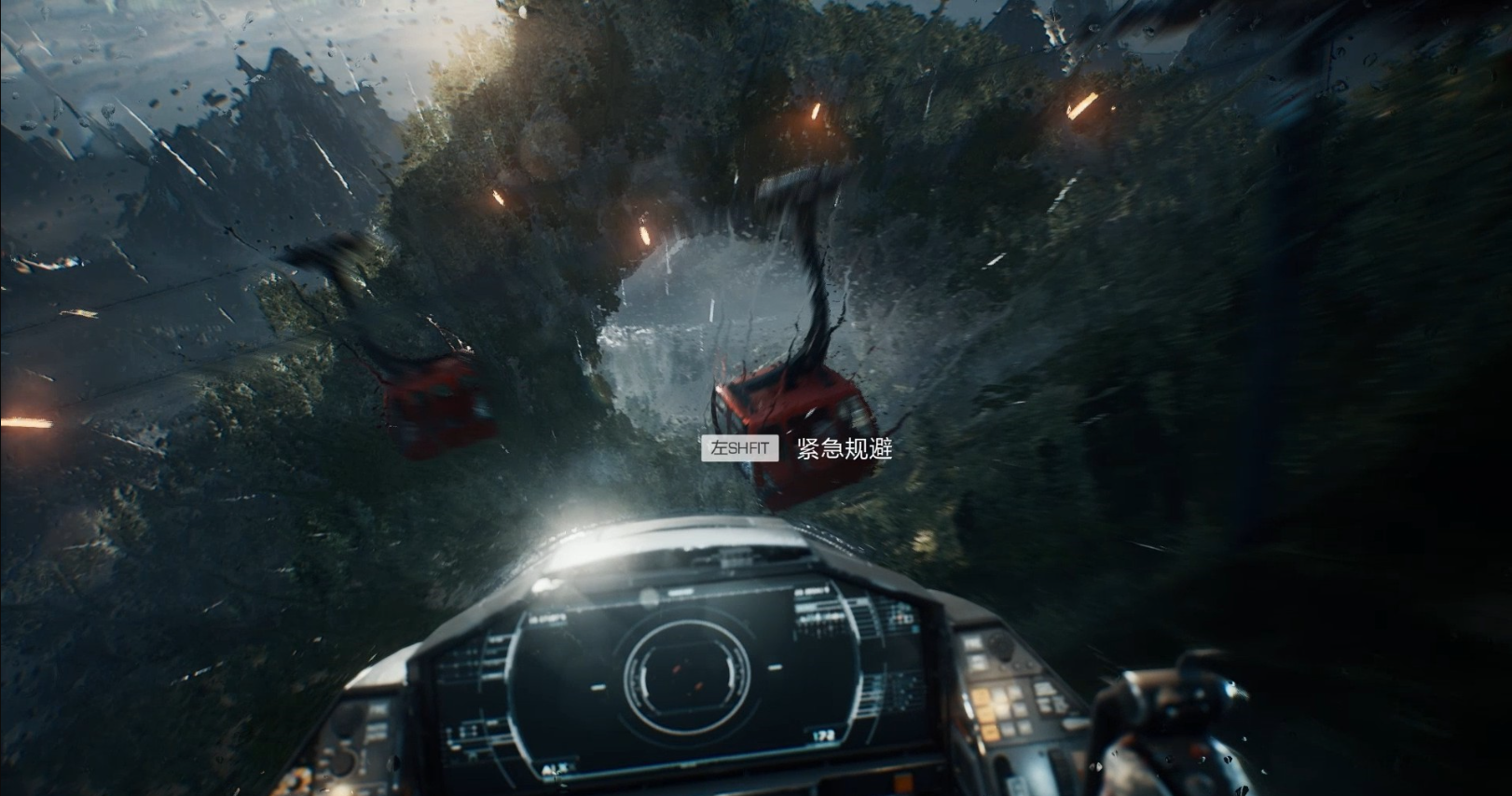 在降低高度后前方突然出现缆车,为了躲避缆车我们需要按下左Shift键让飞机进行紧急规避。