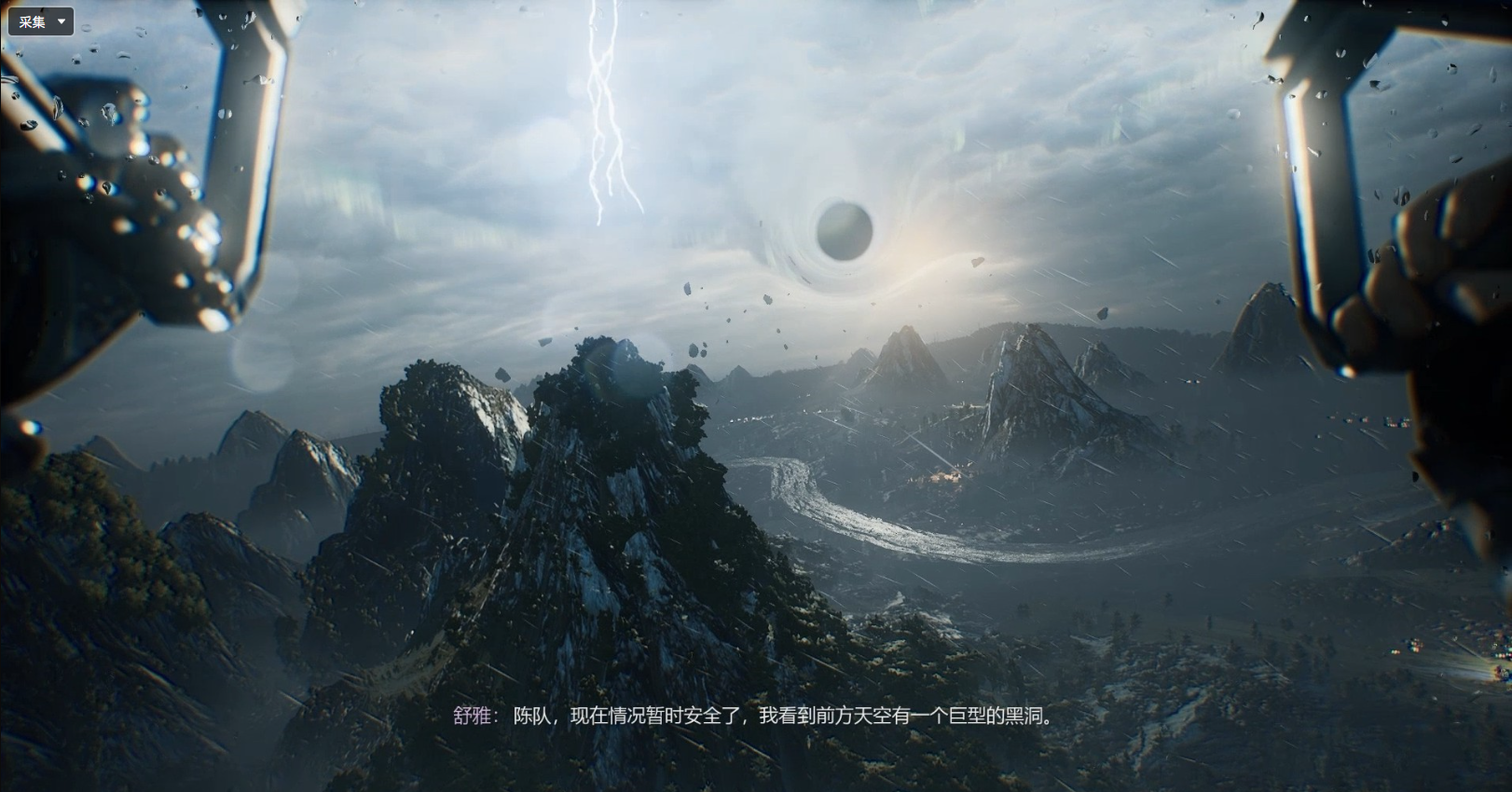 在降落过程中我们发现前方远处的空中有一个黑洞,似乎附近一切的异象都与黑洞有关。