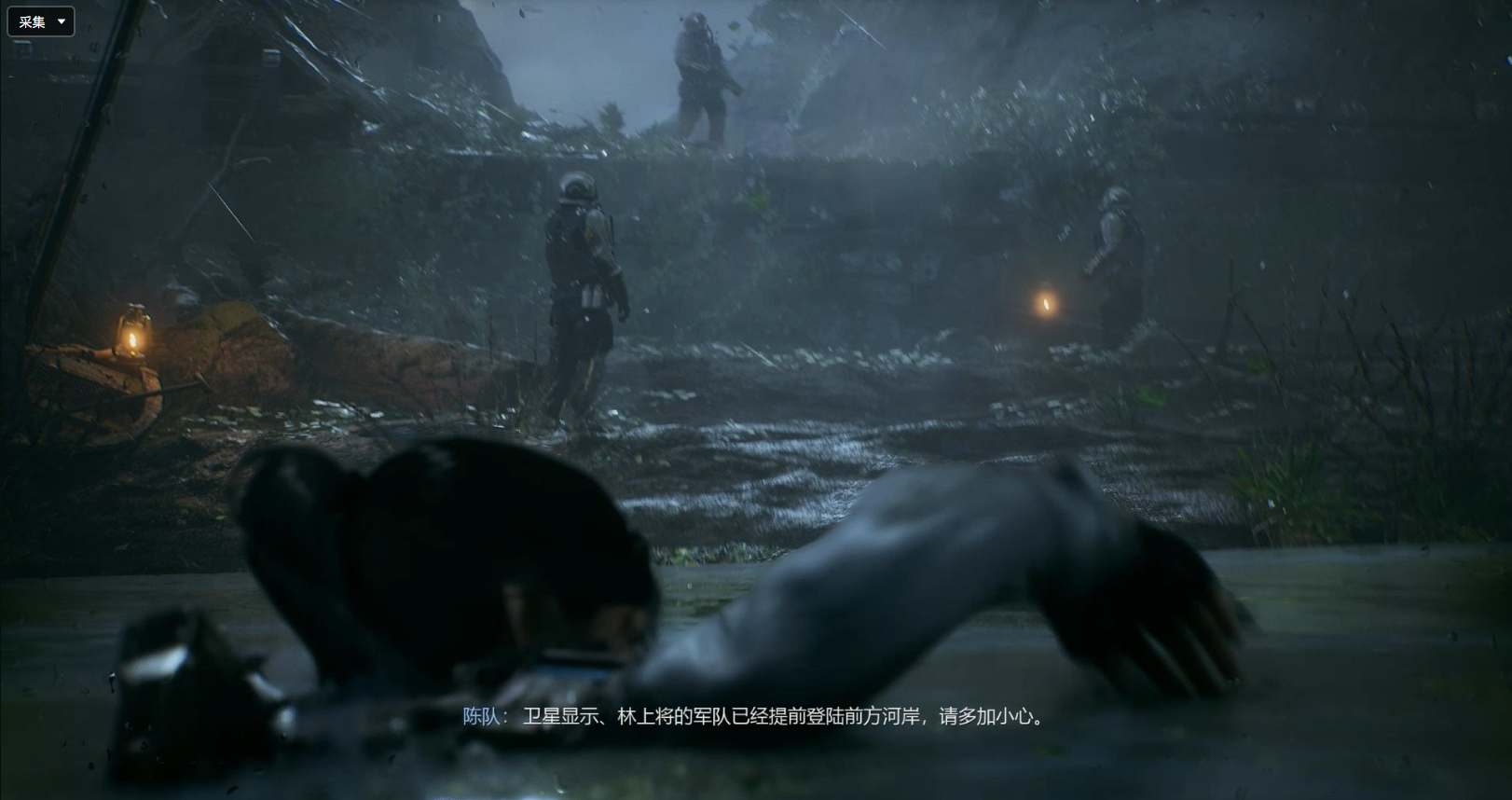 紧急降落到水中后向岸边游去,我们可以看到前方已经有敌人准备阻拦我们前进,战斗一触即发。
