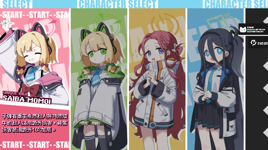 众多人气角色:游戏汇集了多位《蔚蓝档案》中的人气角色,如才羽桃井、才羽绿、爱丽丝、猫冢响等 。每位角色都拥有独一无二的技能机制和攻击方式,例如爱丽丝的武器过热系统、桃井的点火能力等,让玩家可以体验截然不同的战斗风格 。