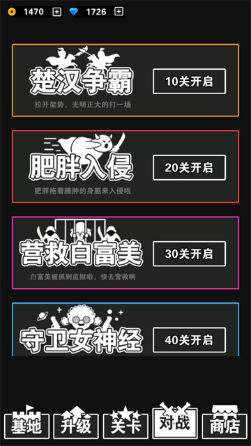 2、丰富多样的副本玩法:游戏精心设计了多个风格迥异的副本,如“楚汉争霸”、“肥胖入侵”、“营救白富美”、“守卫女神经”以及“狭路相逢勇者胜”等。每个副本都有其独特的玩法和挑战目标,极大地丰富了游戏的可玩性,避免了对战的单调感 。