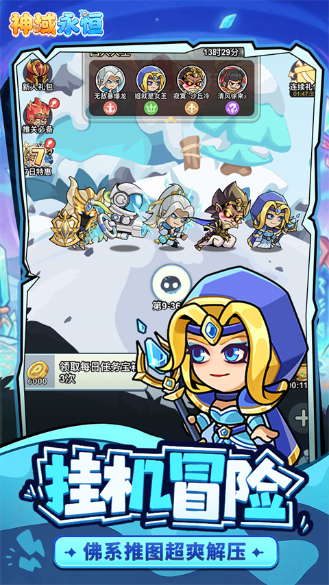 神域永恒是一款Q版画风的放置卡牌策略手游,游戏构建了一个被恶魔诅咒的异世界,玩家将扮演救世主,集结来自不同时空的Q萌英雄,组建一支梦之队,通过策略性的阵容搭配,向恶魔发起挑战,拯救这个失去欢笑的世界 。游戏不仅拥有海量熟悉的英雄角色,更以“一键放置”的轻松养成和“手动释放大招”的畅快战斗为核心,为玩家打造一个既休闲又充满激情的冒险之旅 。