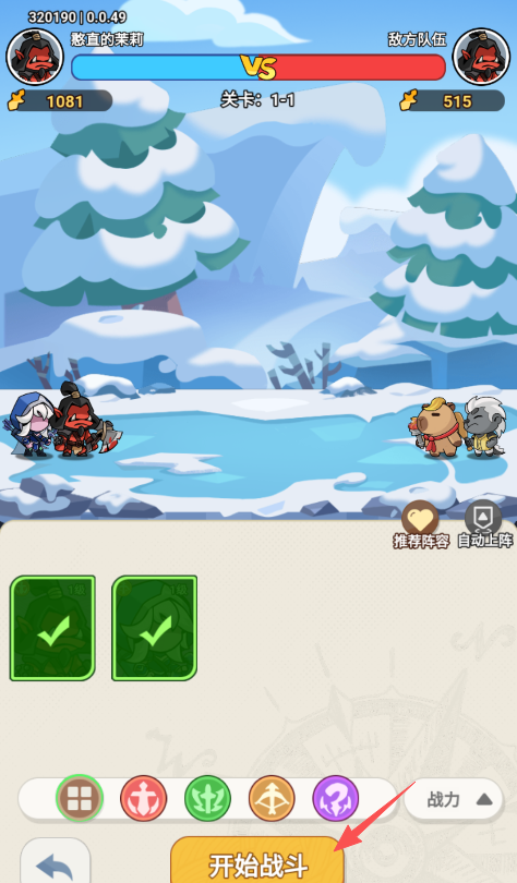 2、上阵所有的英雄,点击屏幕下方的“开始战斗”。