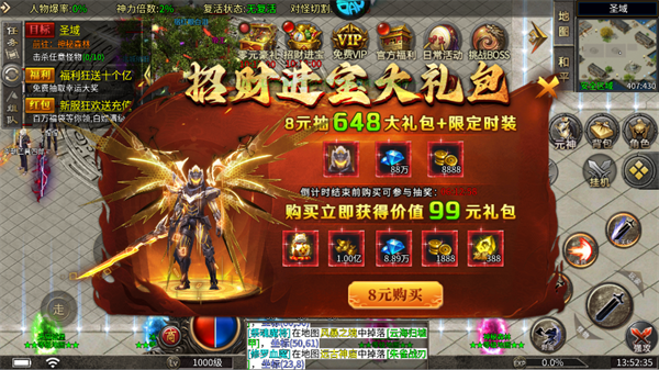 仅需8元即可购买价值99元的招财进宝大礼包,内含1.00亿金币、8.89万钻石等丰厚奖励,同时还可抽取648大礼和限定时装。小额投资,快速拉开资源差距,是新手玩家的必备选择。