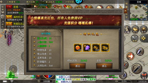 通过击杀怪物和积累积分,你可以激活VIP1,解锁更高的资源获取效率。VIP特权包括回收加成、人物爆率提升、攻击和生命属性加成,全面提升你的战力和资源收集速度。