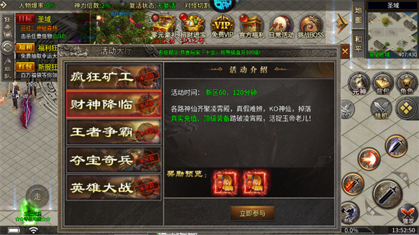 定期参与“财神降临”、“夺宝奇兵”等精彩活动,掉落真实充值卡、顶级装备等稀有资源。新区活动通常在60/120分钟开启,这段时间是资源爆发的关键期,抓住机会让自己迅速提升。