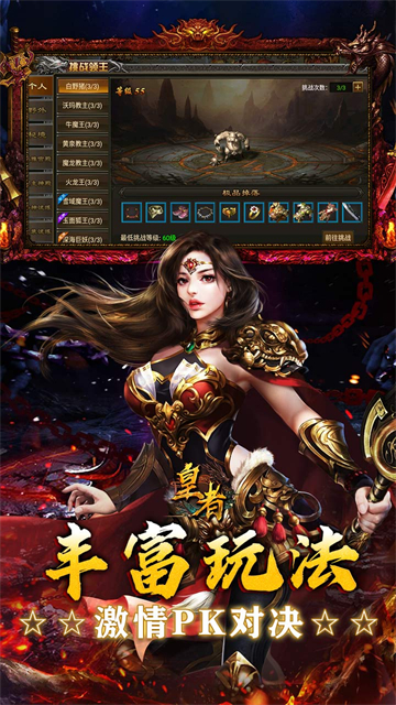 皇者(3.5折复古传奇)是一款完美复刻端游经典的复古传奇手游,以原汁原味的传奇体验为核心,还原了战法道三职业、自由PK爆装备、沙巴克攻城战等经典玩法,让老玩家重温当年在网吧通宵砍传奇的热血激情。该版本所有充值项目均享受3.5折优惠,让玩家用更低的成本体验最纯正的复古传奇。