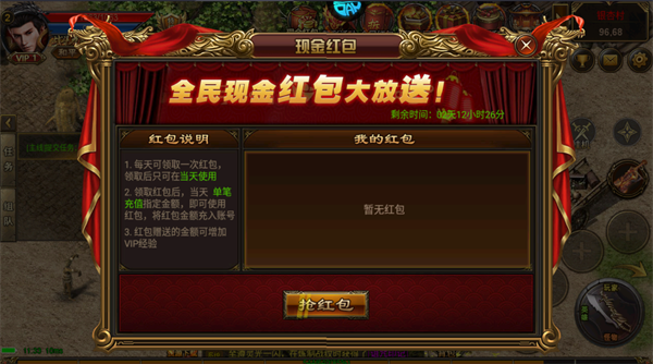 每天可领取一次红包,领取红包后,充值指定金额,即可使用红包,将红包金额充入账号,红包赠送的金额可增加VIP经验。