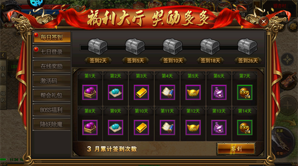 每日签到、七日登录、在线奖励,是稳定获取元宝、材料、经验的基础,上线先领完。
