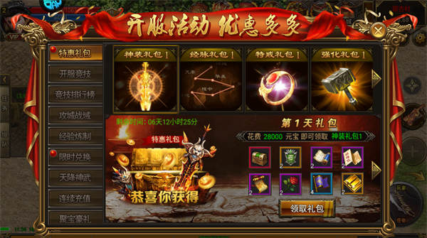 开服前几天的礼包性价比极高,用少量元宝就能换神装、强化材料,战力提升快。