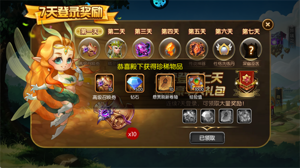 首日登录即可领取高级召唤券、钻石等丰厚奖励,连续7天还能解锁神秘大奖。