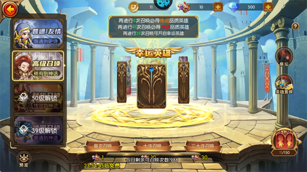 消耗召唤券进行英雄抽取,有保底机制,可获得稀有至神话品质的强力英雄。