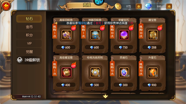 可用钻石购买召唤券、觉醒材料等关键道具,部分商品还有限时折扣。