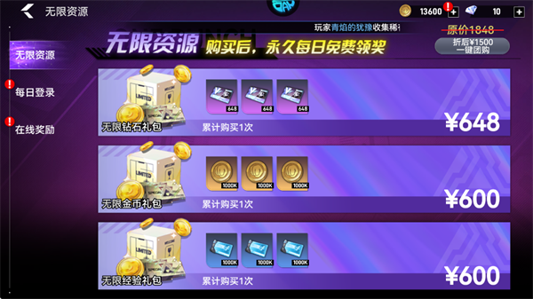 3、0.1折购买无限资源礼包,每日领取海量资源,更有充值卡赠送。