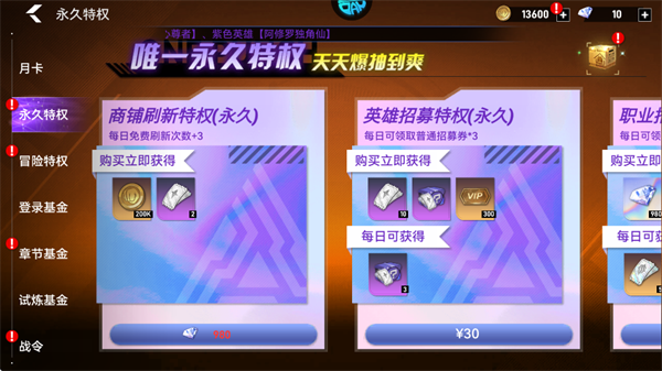 4、活动中的永久特权,升级刷图必备,招募券和钻石每日领取。
