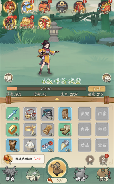 3、武侠挂机轻松玩:门客自动战斗,资源自动产出,上线收菜即可成长,轻松不累。