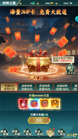 在创神之路页面,直接领取充值0元全民礼包,内含海量元宝和SVIP卡,为前期成长打下基础。