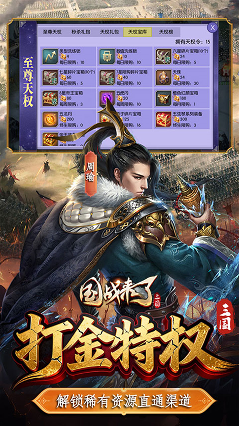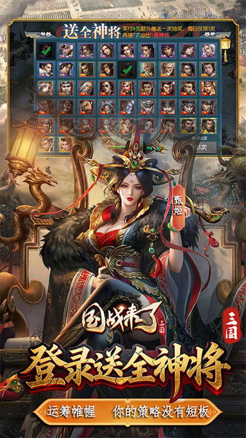 国战来了(0.1折权倾天下)是一款三国题材的大型策略国战手游。此版本为0.1折扣版,可享受0.1折充值优惠,并且内含大量福利,福利翻倍、打金掉真充、顶级道具、完成任务狂送10万元宝等等。玩家将扮演一方诸侯,选择魏、蜀、吴三大势力之一,从建设一座荒芜的小城开始,逐步招募名将、发展科技、结交盟友,亲自操控部队,在宏大的世界地图上与成百上千的盟友一起,对敌国城池发起集团冲锋。赶快来这里一起共筑大业吧。