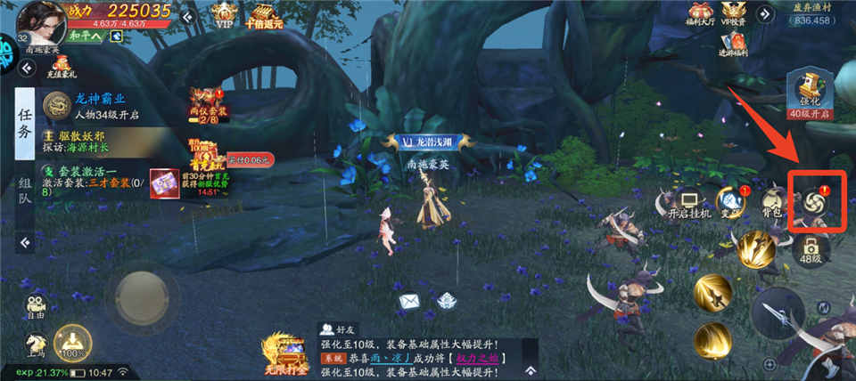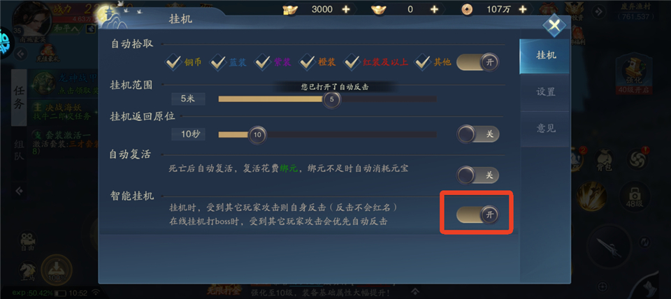 3、点击【智能挂机】右边的按钮就可以了,开启智能挂机后,受到其他玩家攻击可以自动反击,在线挂机打BOSS时,受到其他玩家攻击也会优先自动反击。