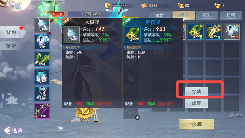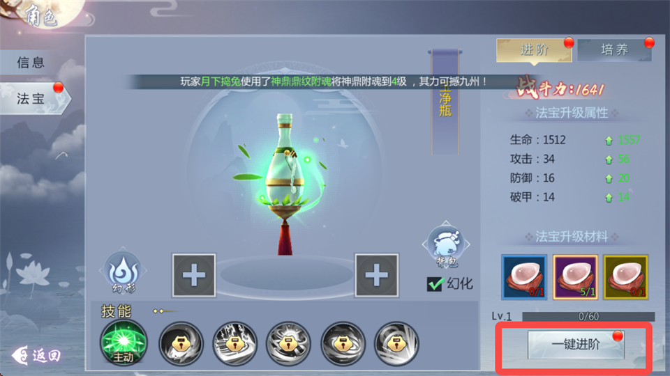 使用法宝材料可以升级法宝、提高生命、攻击等属性,还可解锁更多技能。