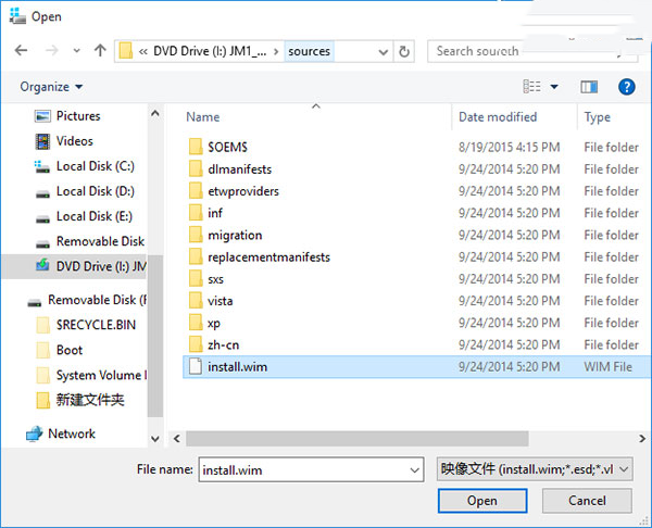 选择虚拟光驱中sources文件夹中的install.wim。