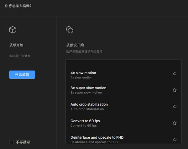 4、一旦你导入了视频,就会弹出一个覆盖在工作区布局上的菜单。简单来说,这个菜单设计是为了让用户决定是立即使用现有的预设还是从头开始。