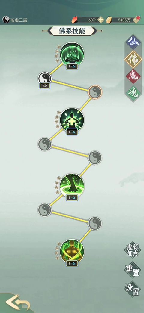 练气大圆满可以可以重置天赋,选着佛一,佛二,剩下的优先将生命点到40级。然后点佛三佛四。可以在筑基和金丹期完美度过。