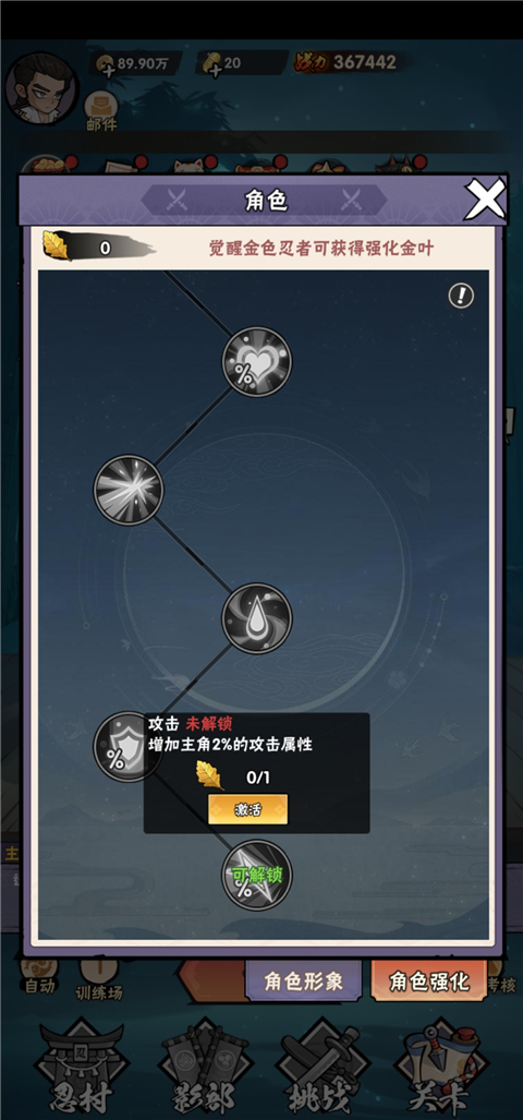 使用强化金叶解锁和升级技能,提升忍者实力。