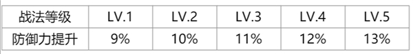 司马师战斗中防御力提升9%/10%/11%/12%/13%(1-5级)。