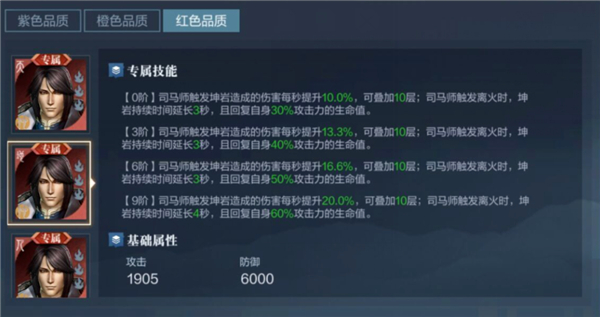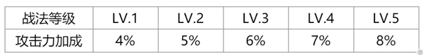 司马师战斗中攻击力提升4%/5%/6%/7%/8%(1-5级)。