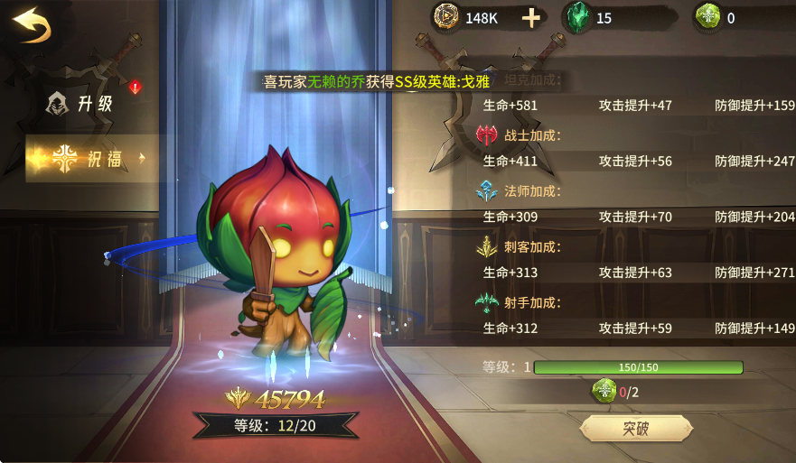 4、角色的升级只需要保持同召唤师同等级即可,而品阶的升级这就显得格外重要,需要注意的是,保证品阶的属性提升适配于该英雄的职业。
