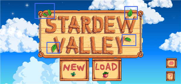 2、在游戏标题界面,可以看到英文标题的”左上”、”左下”、”右上”、”右下”四个角都有叶子。