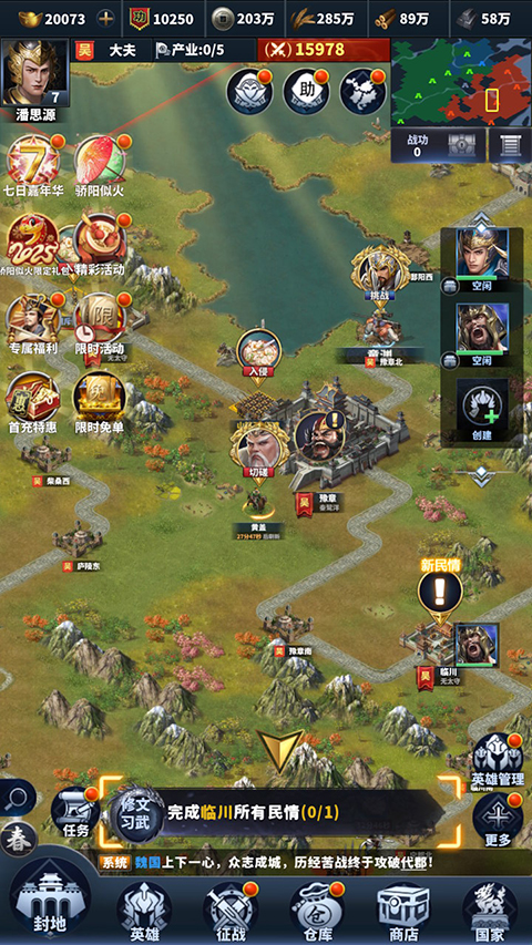 4、军政并行,玩法多元:不仅注重军事对抗,更内置内政经营、科技研发、计谋派遣等玩法。玩家需平衡资源生产与军队扩张,通过“计策府”派遣间谍、策反敌将,实现不战而屈人之兵。